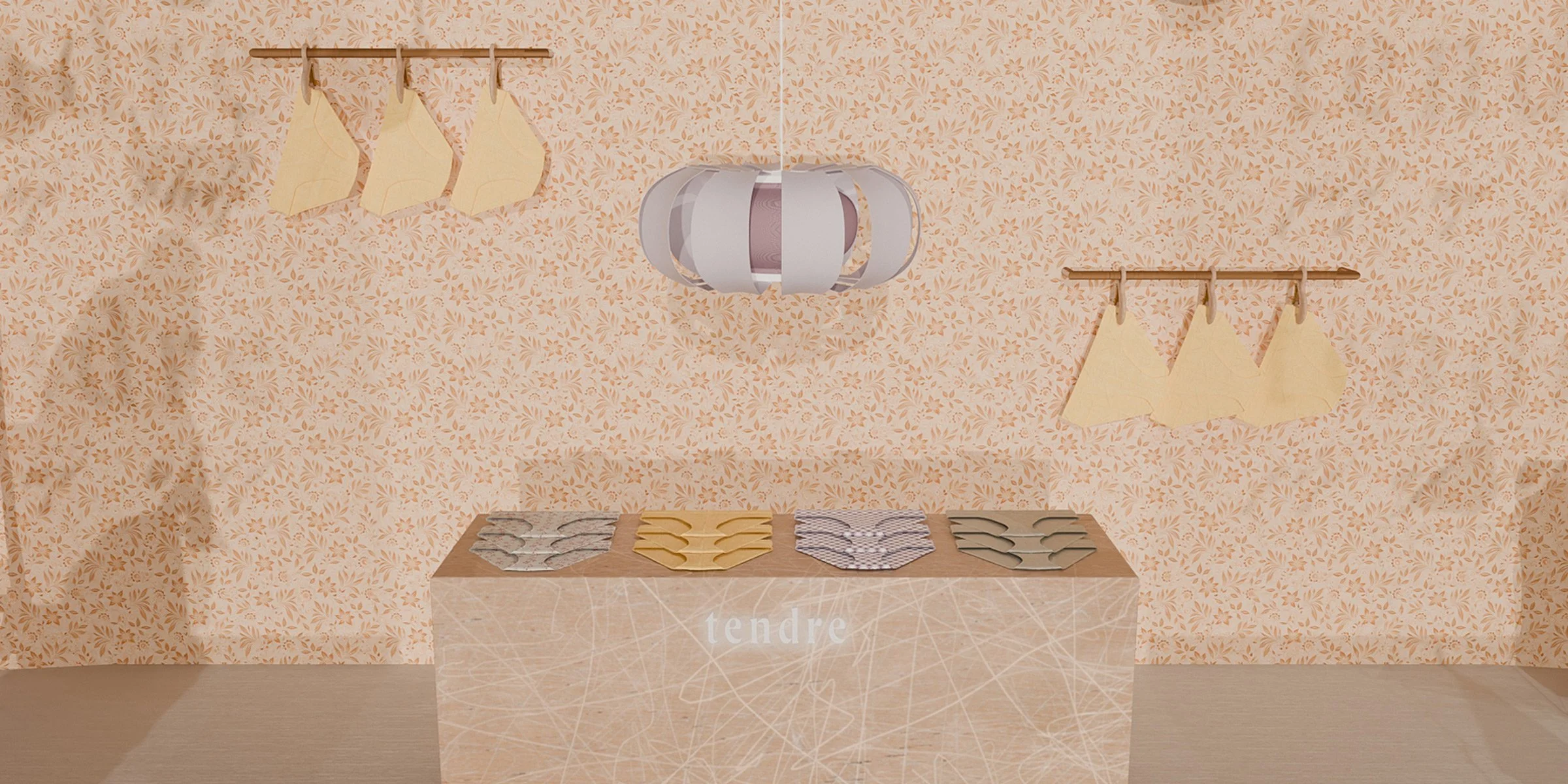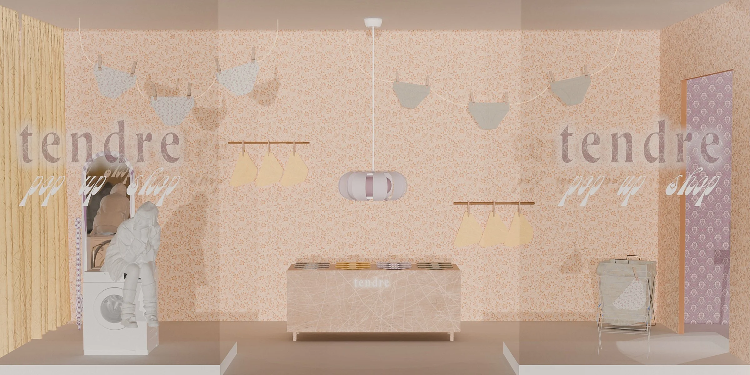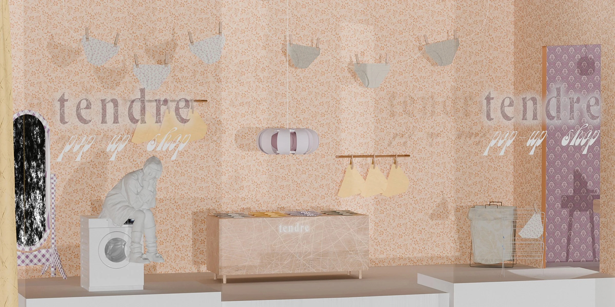 Tendre is an intimate apparel label focused on unique prints and organic, sustainable, gentle materials. This pop-up shop highlights the newest underwear line with a playful, 80’s-inspired space that provokes memories of home and routine. The design offers comforting reminders of a simpler time with signs of a low-tech, unrushed laundry-day experience. The following 3D mockups were designed using Blender.