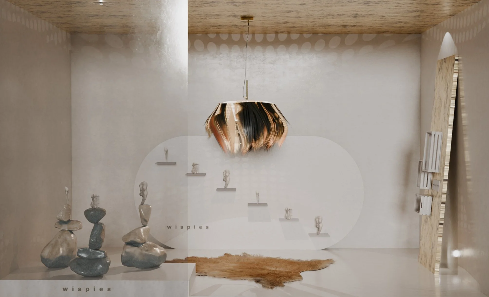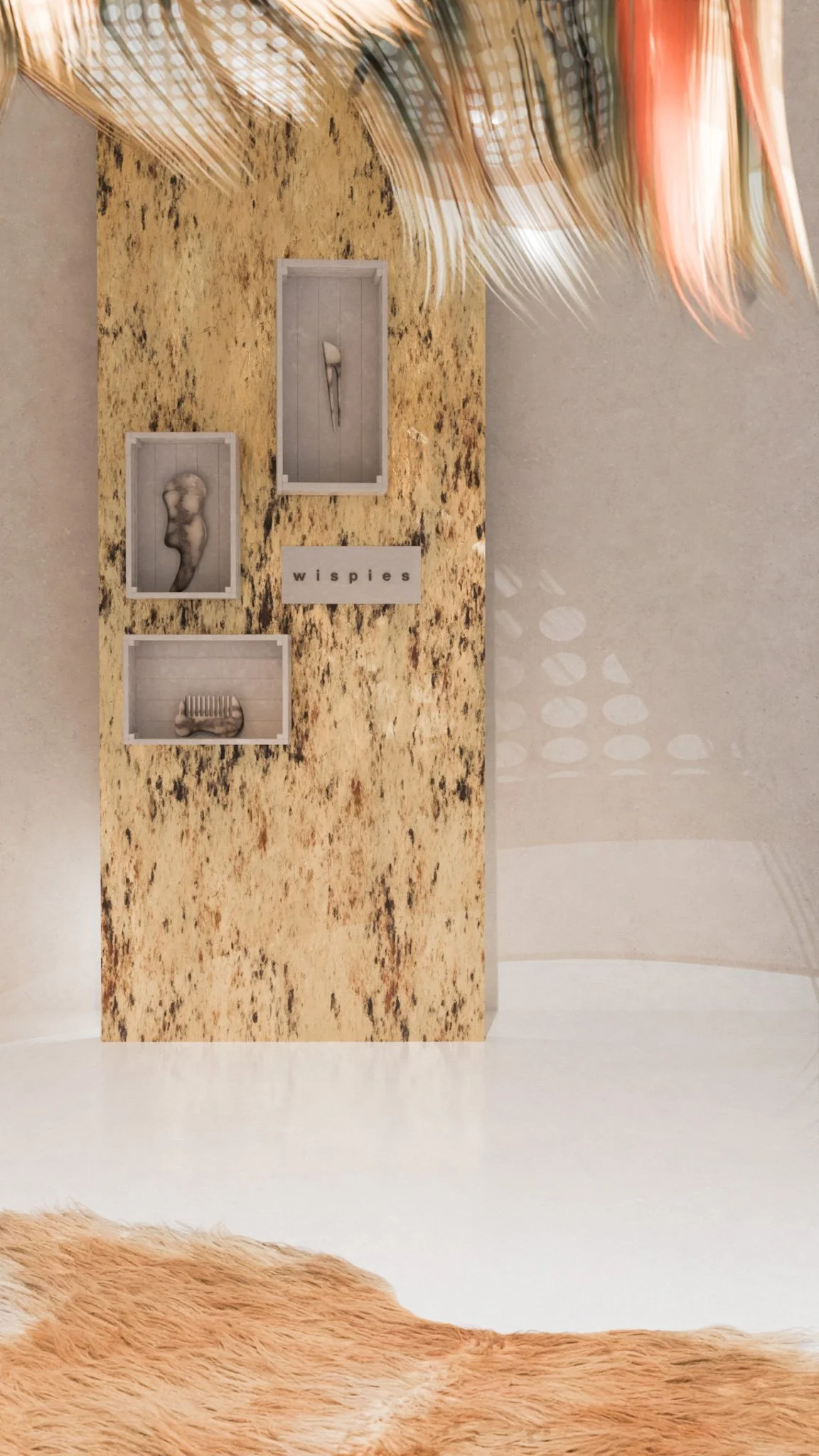 The space featured is a pop-up showroom designed to mark the release of Wispies’ first collection. The small objects are presented in a large, open, tactically sensuous space designed to intrigue and engage, encouraging social media and influencer interaction. The 3D mockups were designed using Blender.