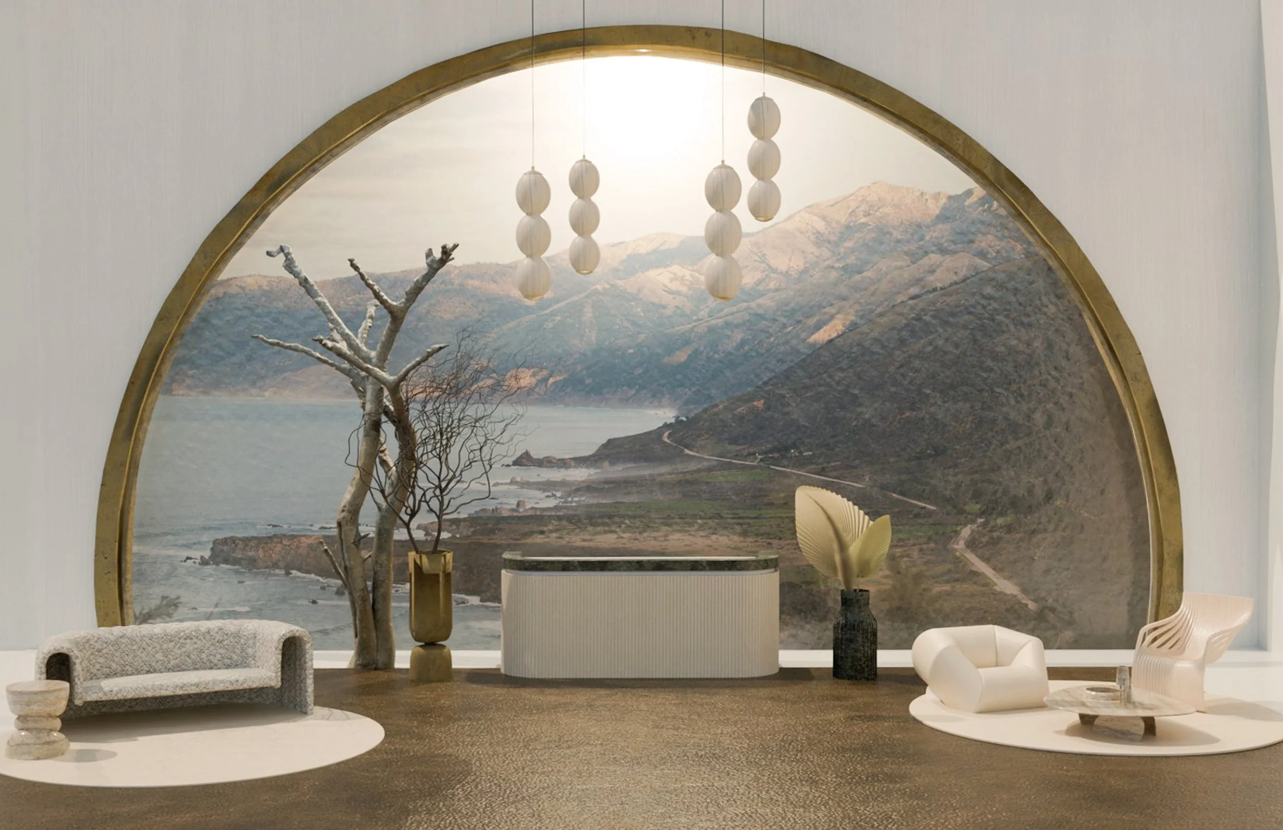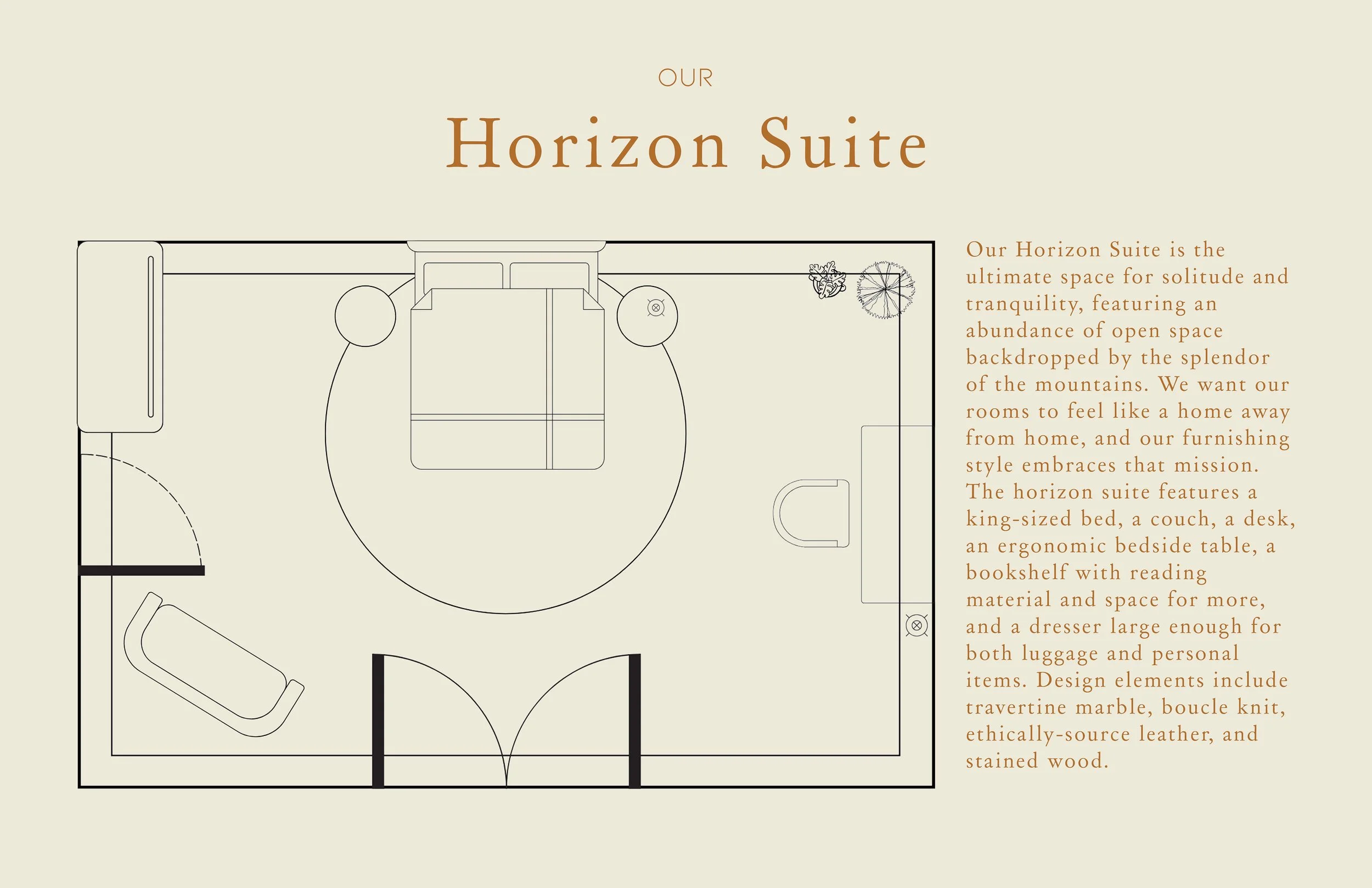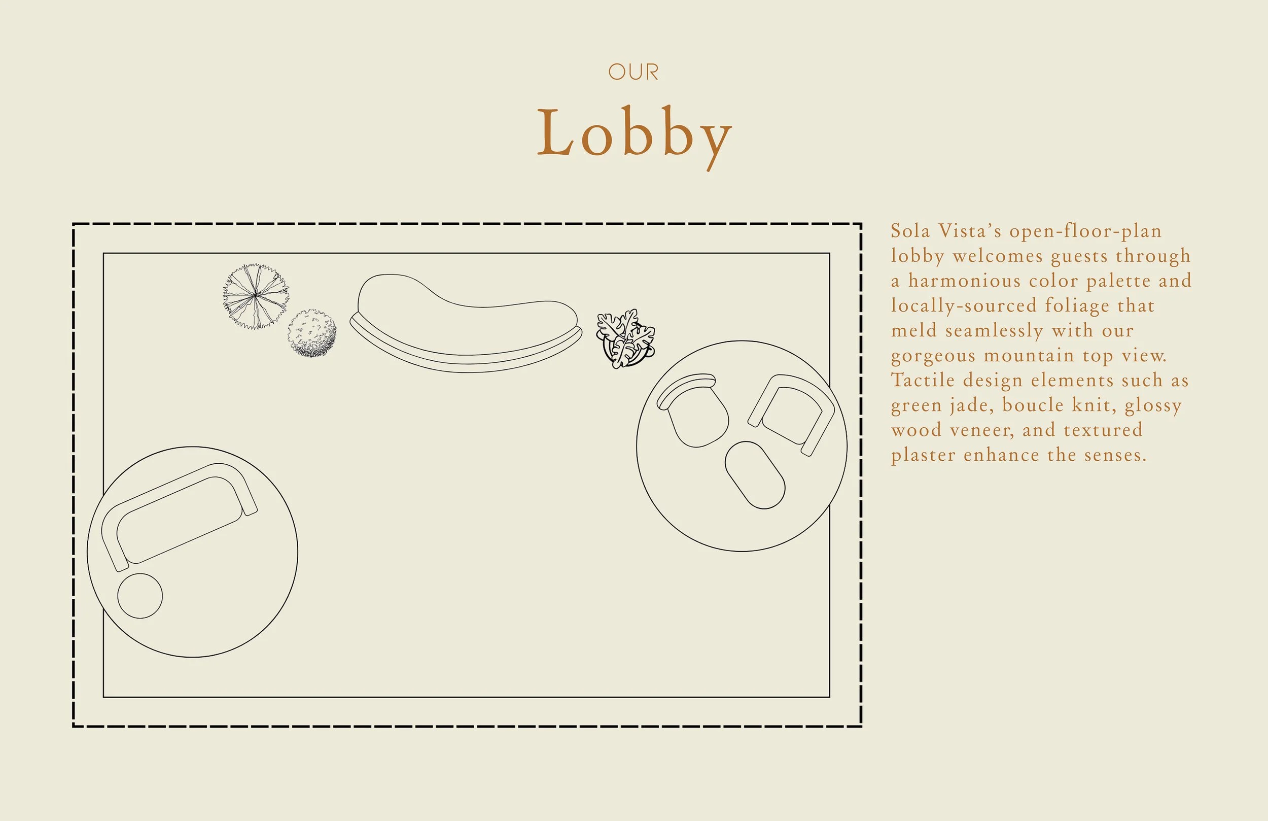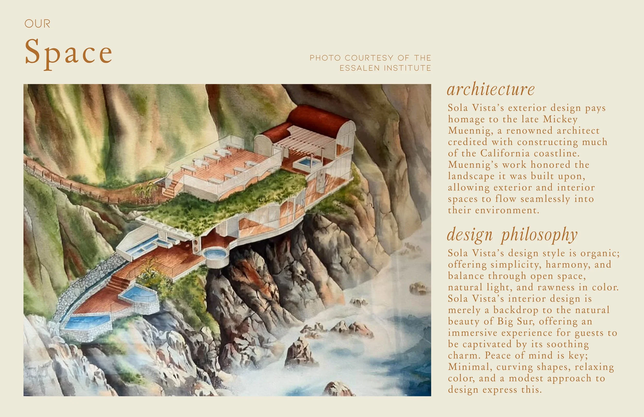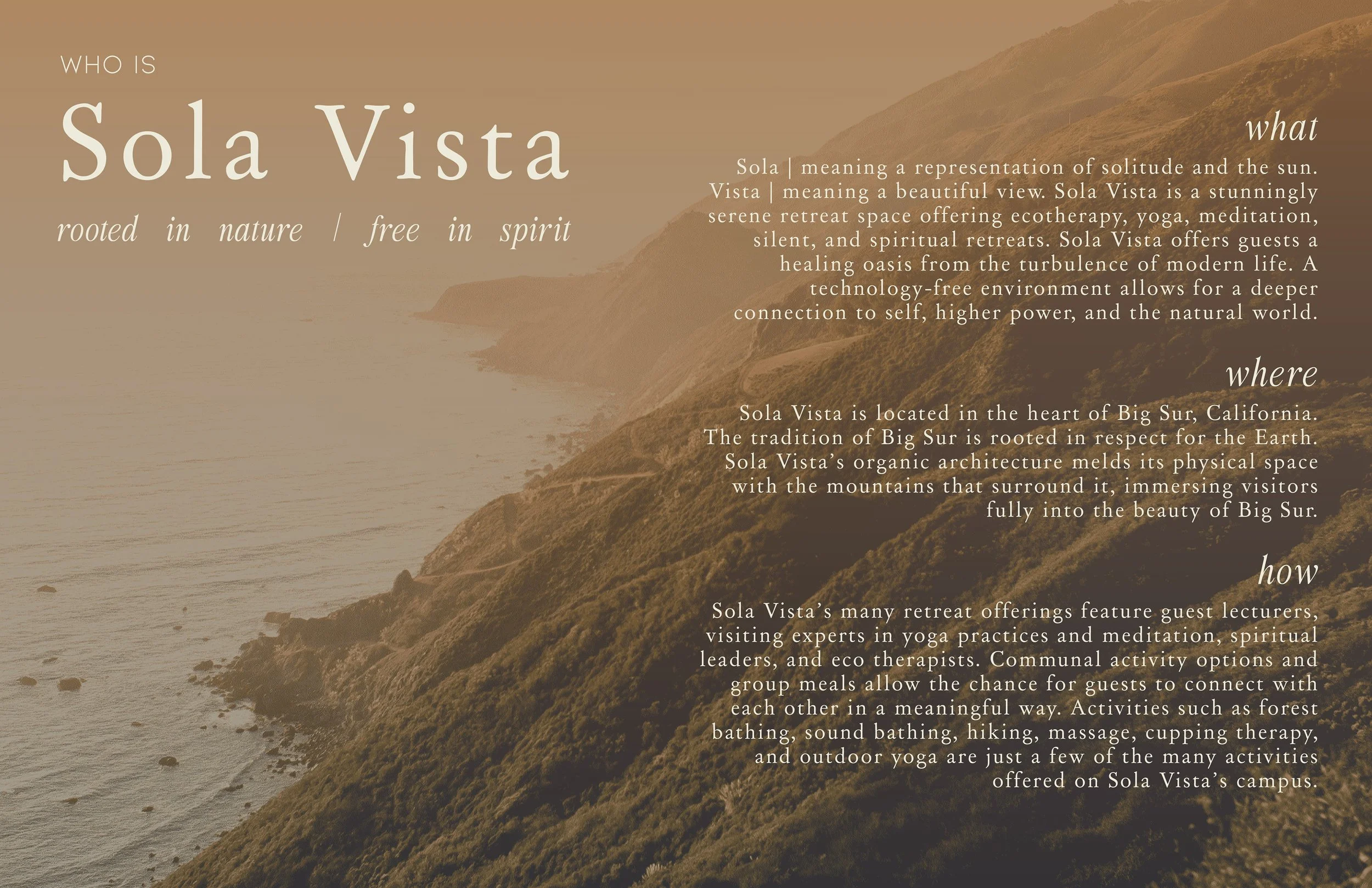 The architectural style and interior styling of Sola Vista, an ecotherapy retreat center located in Big Sur, honor the aesthetic and spiritual history of its location, as well as the legacy of renowned architect, Mickey Muennig. The space is informed by zen design principles and the aesthetic imperatives of wabi sabi. Sola Vista’s visual identity honors and situates a harmonious interaction between people, nature, and space. Design and location come together to create a place for authenticity, community, and immersion through a perfectly imperfect look. Promotional assets and original prints were designed using the Adobe Suite. The room mockups were created using 3D modeling software, Blender.